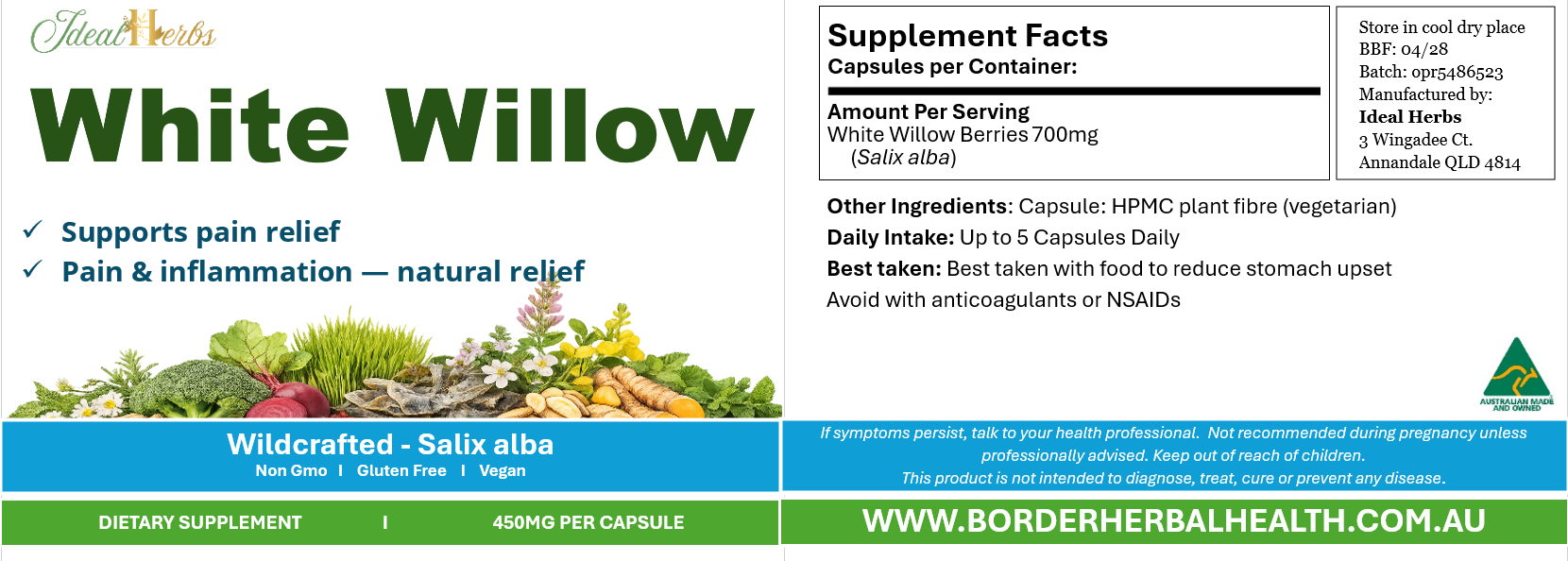 I make no therapeutic claims regarding the use of my health supplements. These supplements are not offered to prevent, diagnose, cure or alleviate a disease, ailment, defect or injury. Generally, if you are pregnant, nursing, have any health condition or are taking any medications, it is recommended that you consult your health care professional before using herbs, including culinary herbs. Please keep out of reach of children. Store in a cool, dry place.